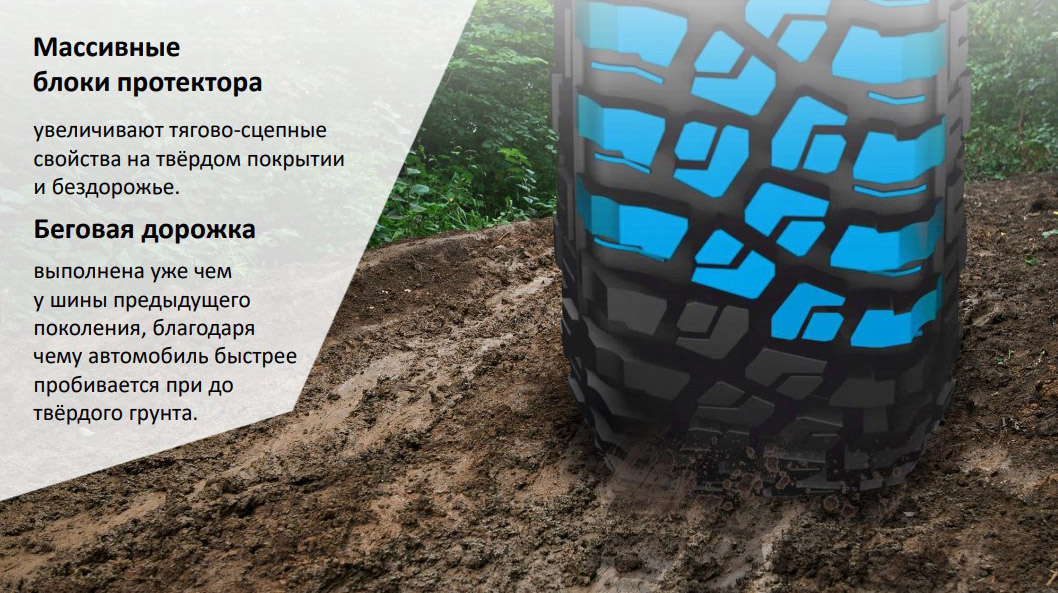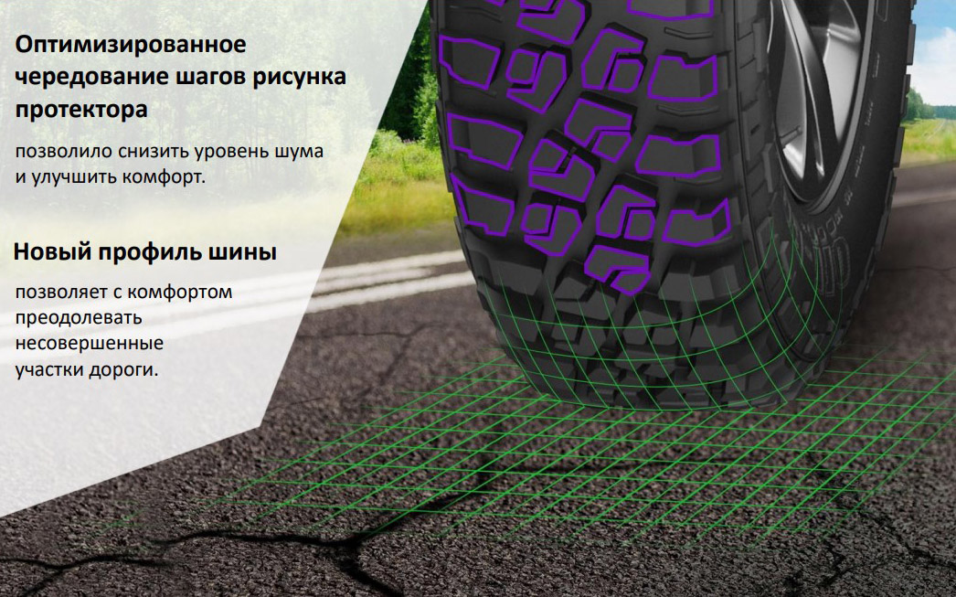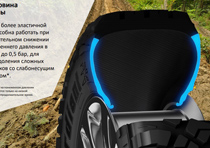 Многоступенчатые шашки протектора обладают лучшими сцепными характеристиками, обеспечивая отличную тягу на плохих дорогах и уверенное поведение на асфальте. В сырую погоду и в глубоких лужах шины выводят воду из пятна контакта, предупреждая риск возникновения аквапланирования.