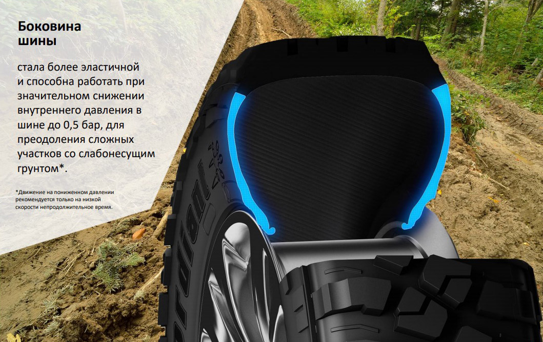 Глубокие разнонаправленные канавки беговой дорожки расположены таким образом, чтобы грязь и камни быстро высвобождались из протектора, предупреждая повреждения и продлевая срок службы шины.