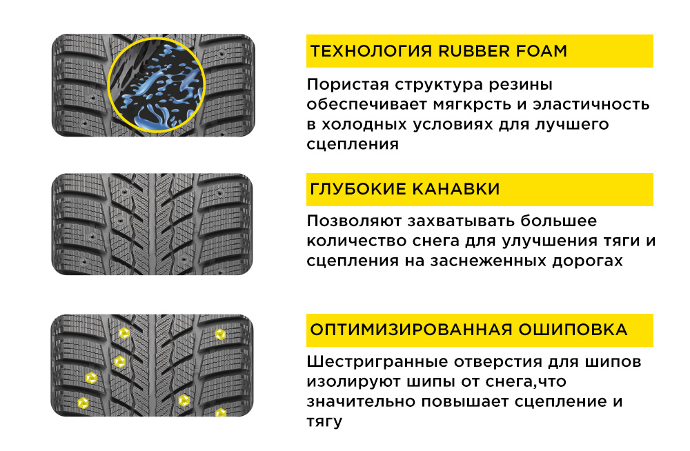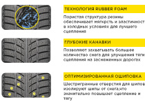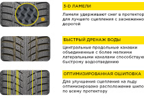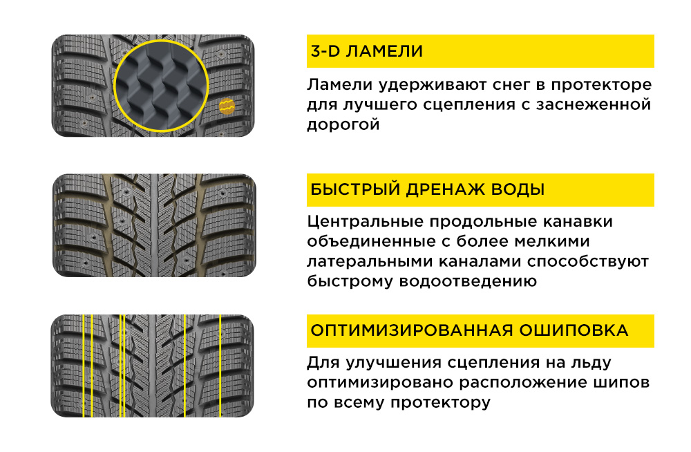 Шипы с острыми кромками обеспечивают надежное сцепление на укатанном снегу и льду. Благодаря ламелям протектор лучше прилипает к снегу, что позволяет придерживаться заданному курсу направления.
