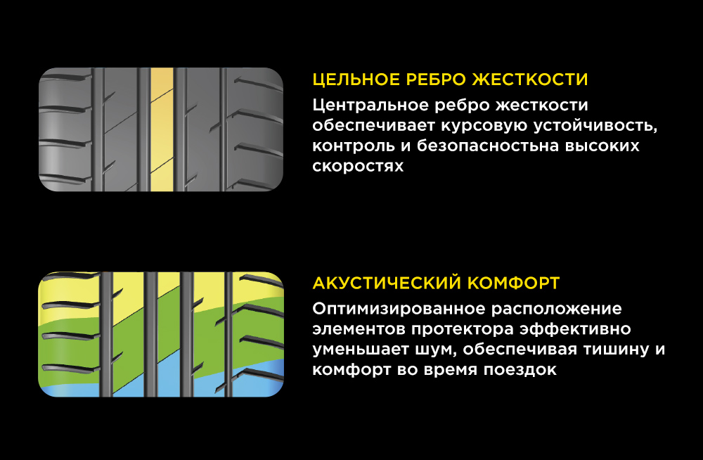 Оптимизированный рисунок протектора эффективно перераспределяет звуковые потоки таким образом, чтобы колесный шум становился практически незаметным во время поездок.