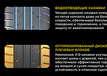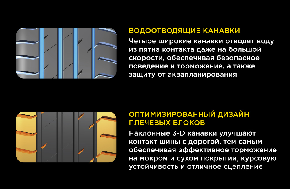 Благодаря четырем основным широким канавкам пятно контакта эффективно очищается от воды, что гарантирует устойчивость и безопасность на мокрых покрытиях. Для усиления дренажного эффекта на плечевых блоках расположены более мелкие поперечные канавки, по которым вода перенаправляется наружу из протектора, тем самым повышая качество торможения, управляемость и сопротивление аквапланированию.