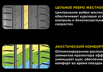 Улучшенная форма плечевой зоны способствует более прочному сцеплению за счет увеличенной площади пятна контакта. Таким образом, улучшаются характеристики торможения, курсовой устойчивости и маневренности.