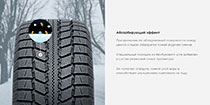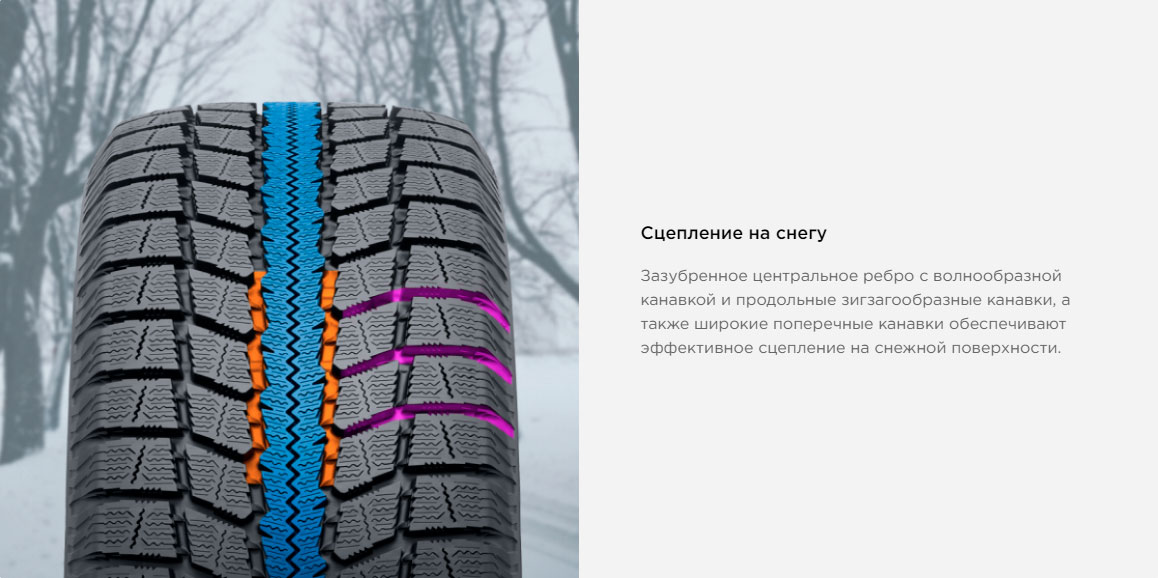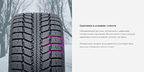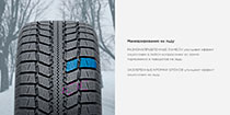 Направленный рисунок протектора имеет отличные сцепные свойства со снегом. Улучшенное очищение от снега происходит за счет чередующихся поперечных канавок, расширяющиеся от центра к плечевой зоне. Продольные каналы с зигзагообразными кромками дают дополнительный запас сцепления.