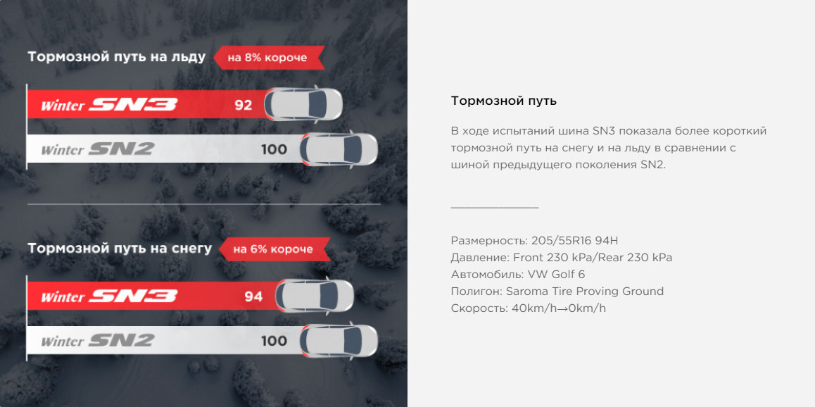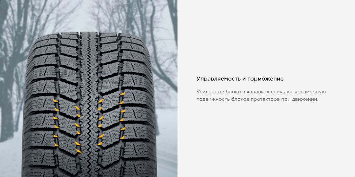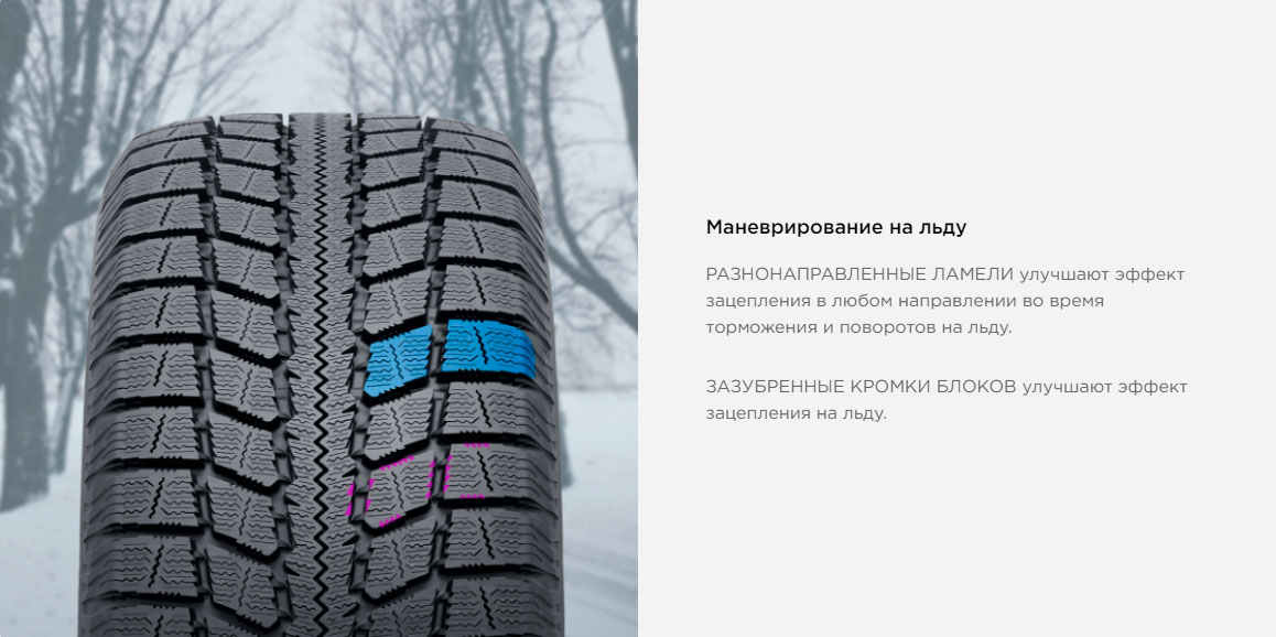 Для устойчивости на поворотах и эффективного торможения на льду, центральные блоки протектора имеют густую сеть разнонаправленных ламелей: мультиволновые ламели снижают деформацию во время торможения и повышают управляемость, что уменьшило тормозной путь шины на 8% по сравнению с моделью предыдущего поколения.