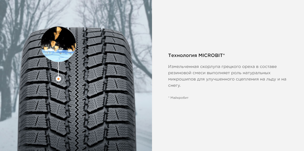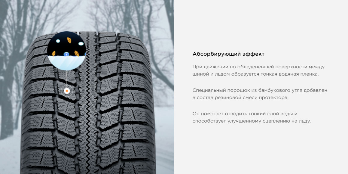 В составе компаунда содержится абсорбирующий угольный порошок, который поглощает ледяную пленку с поверхности дорог, за счет чего сохраняется надежное сцепление и высокий контроль на обледенелых покрытиях. Повышают сцепные свойства твердые микрочастицы скорлупы грецкого ореха, содержащиеся в резиновом составе протектора. При контакте с дорогой твердые частицы цепляются за скользкие покрытия, выполняя роль микрошипов.