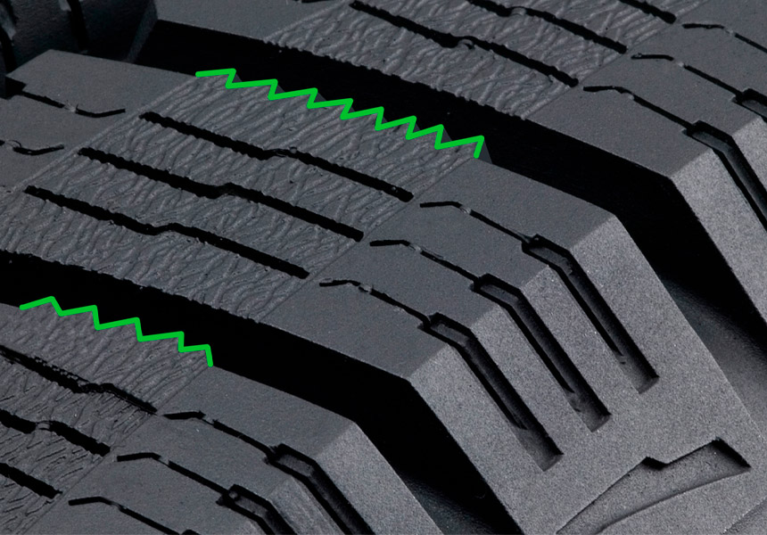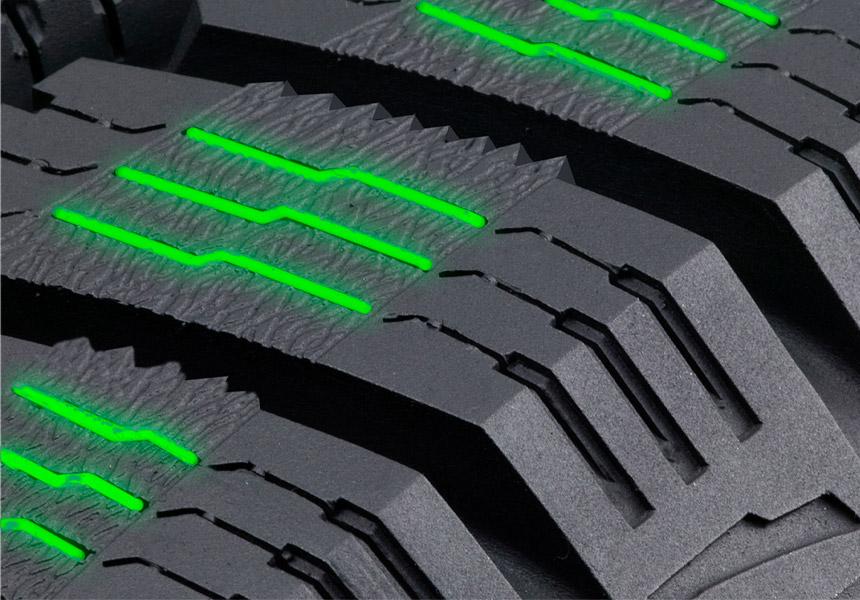 В условиях заснеженных или обледенелых дорог шина остается стабильной и обеспечивает надежное сцепление за счет густой сети ламелей. Широкие направленные канавки отвечают за отведение воды из пятна контакта, что предупреждает возникновение аквапланирования и эффективное торможение на мокрых дорогах.