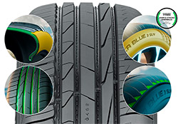 Арамидные волокна в составе резины боковины защищают шины от повреждений и порезов вследствие внезапных ударов или случайных наездов на ямы. Технология Off-Road Claws – грунтозацепы особой формы, расположенные в плечевых зонах, усиливают сцепление и помогают выгребать из сложных дорожных участков. Поэтому при торможении или разгоне по рыхлому покрытию сохраняется высокий контроль над автомобилем без пробуксовки.