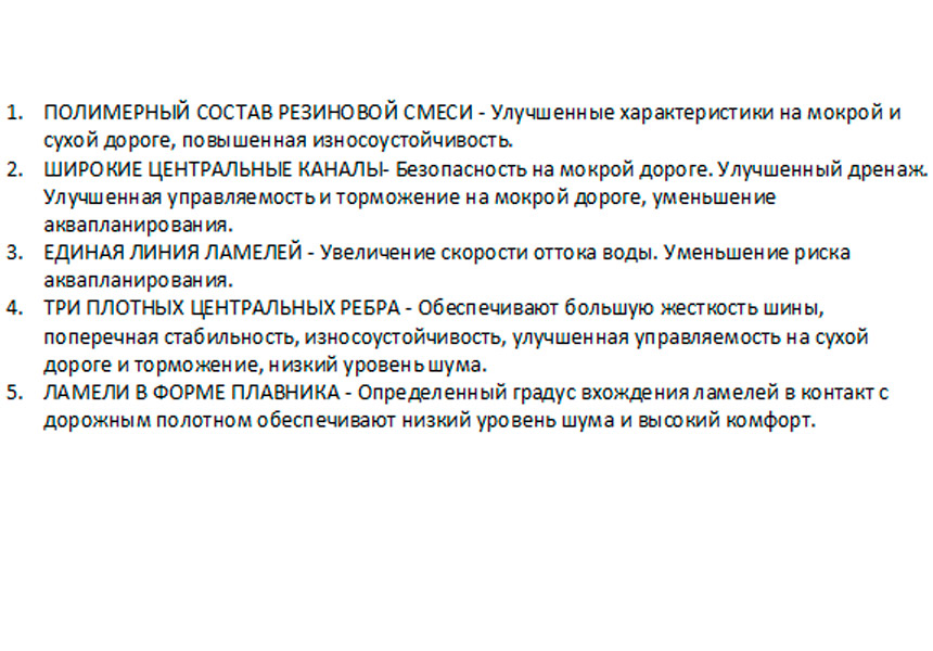 Широкие центральные дренажные канавки достаточно быстро отводят воду из зоны контакта. За счет этого шина показывает высокое сопротивление эффекту аквапланирования, отличную управляемость и минимальный тормозной путь на мокром покрытии. А также расположение ламелей на одной линии позволяет ускорить отток воды, снижая риск аквапланирования.