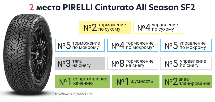 Новая Pirelli заняла второе место в тесте, что является значительным улучшением по сравнению с предыдущей моделью. Cinturato All Season SF2 – закругленная шина, с очень хорошими показателями торможения по сухому, неплохими характеристиками на мокрой дороге и тихой комфортной ездой с самым низким сопротивлением качению в тесте.