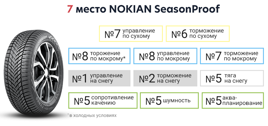 Nokian SeasonProof отлично справлялась со снегом и обладала хорошим уровнем комфорта, но плохие тормозные характеристики на влажном и сухом покрытиях делают шину не самым лучшим вариантом для использования в условиях мягких зим.