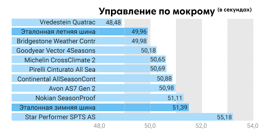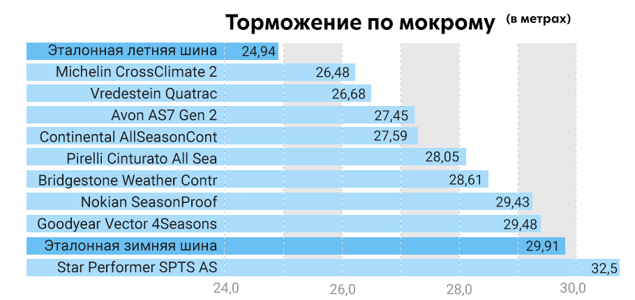 - Самый короткий тормозной путь на мокром покрытии при теплой температуре