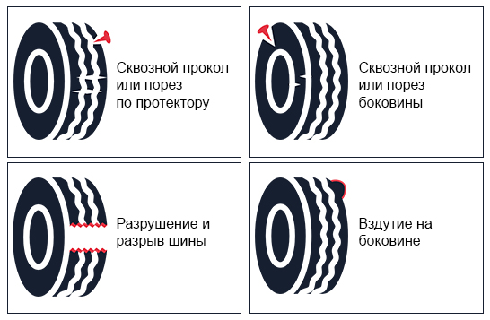 - повреждения шин, связанные с несоблюдением правил эксплуатации шин (не соответствие сезонности, рекомендуемому типоразмеру, индексу скорости и т.д);